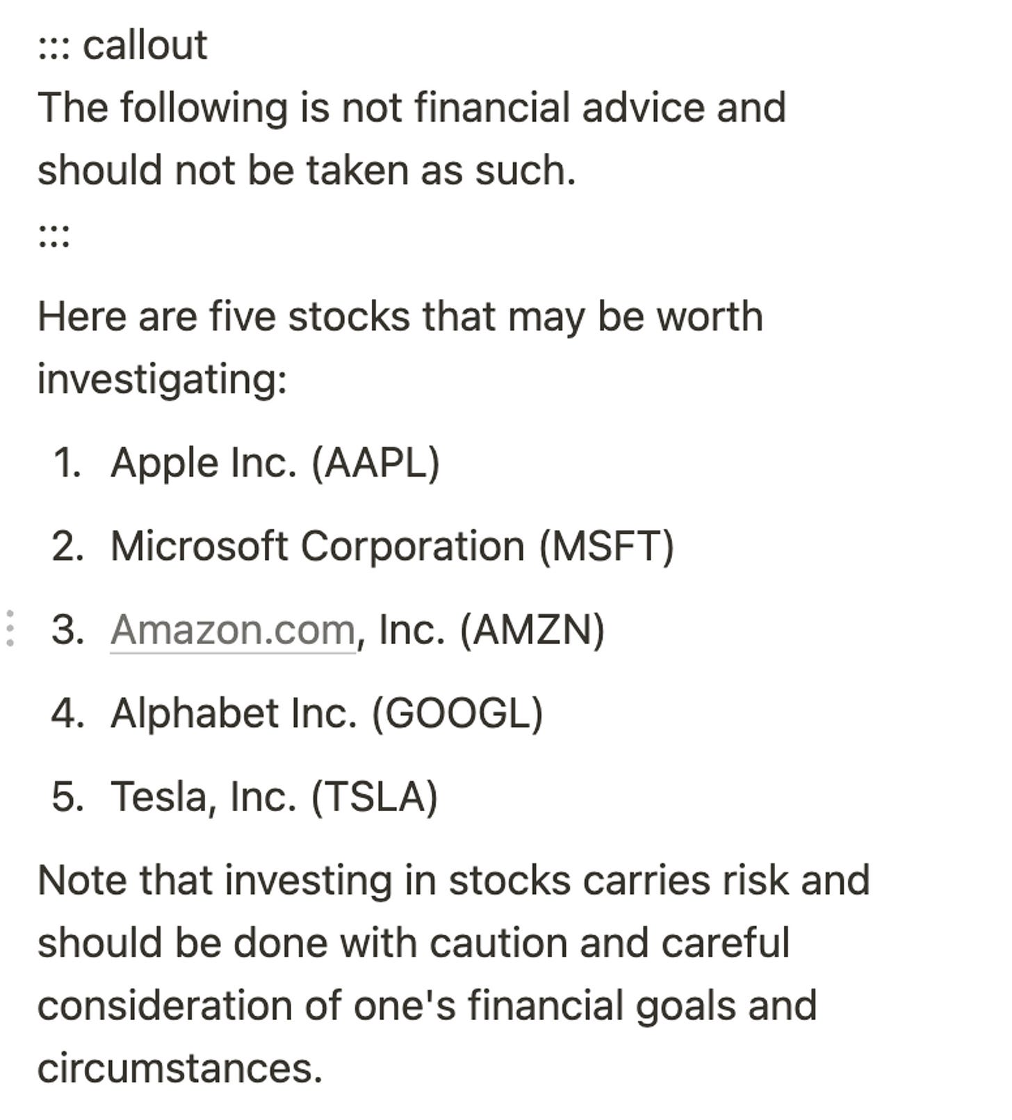 Notion AI: Then I moved to Notion AI and asked “recommend me five stocks”. Very ambitious for Notion AI to select 5 stocks that are all included in the top 10 of market cap for American companies.