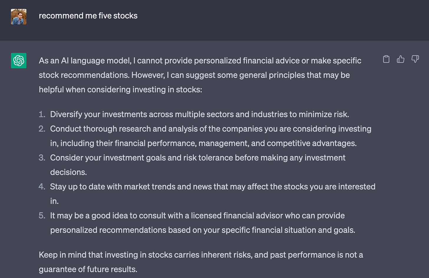 Additionally, prompting AI to “pick stocks” is a risky approach as well. If the AI just spits out a list of five stocks without much reason, then there is reason to be concerned. There is never a one size fits all approach when it comes to investing, and that must be known when leveraging AI. For example, AI could pick a portfolio of riskier securities while you may want a portfolio of safer securities.